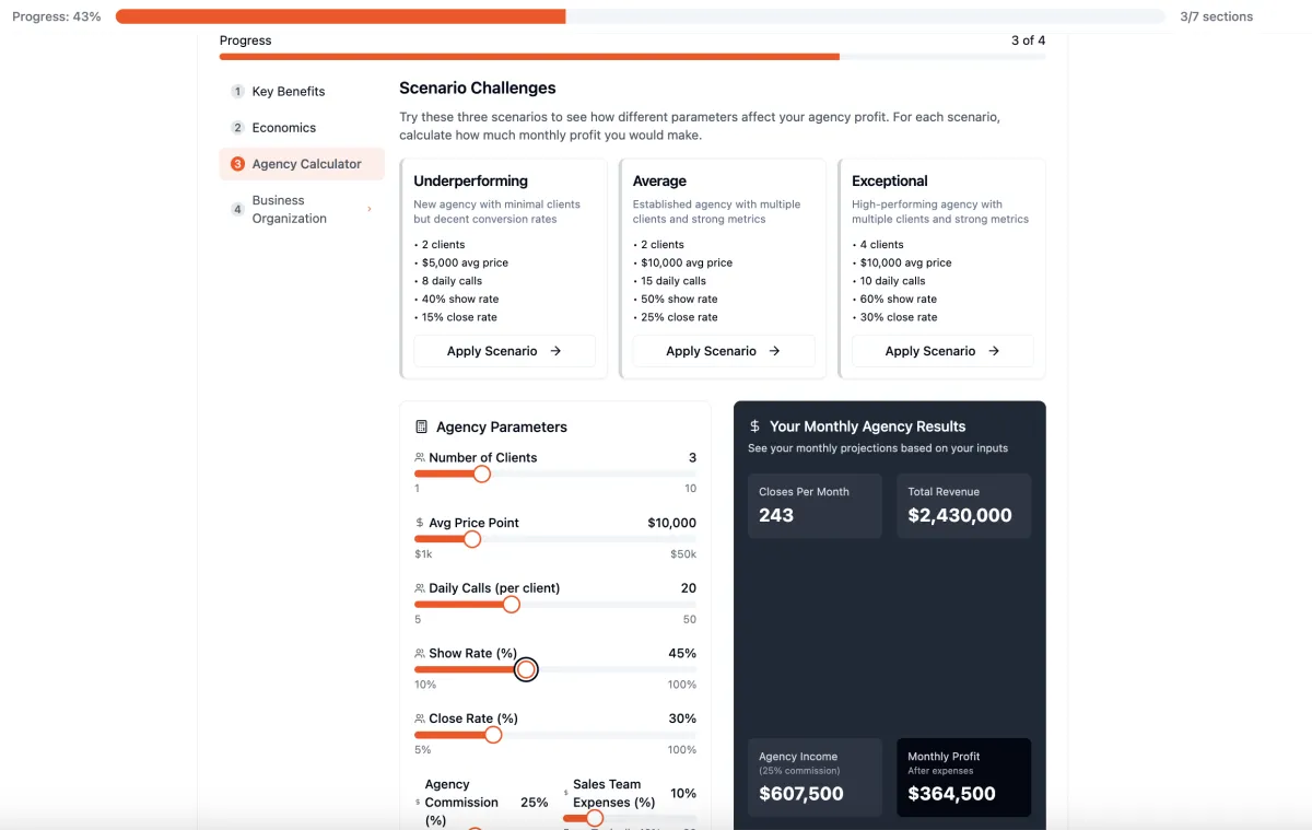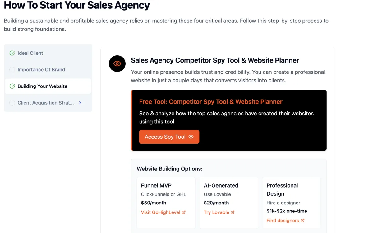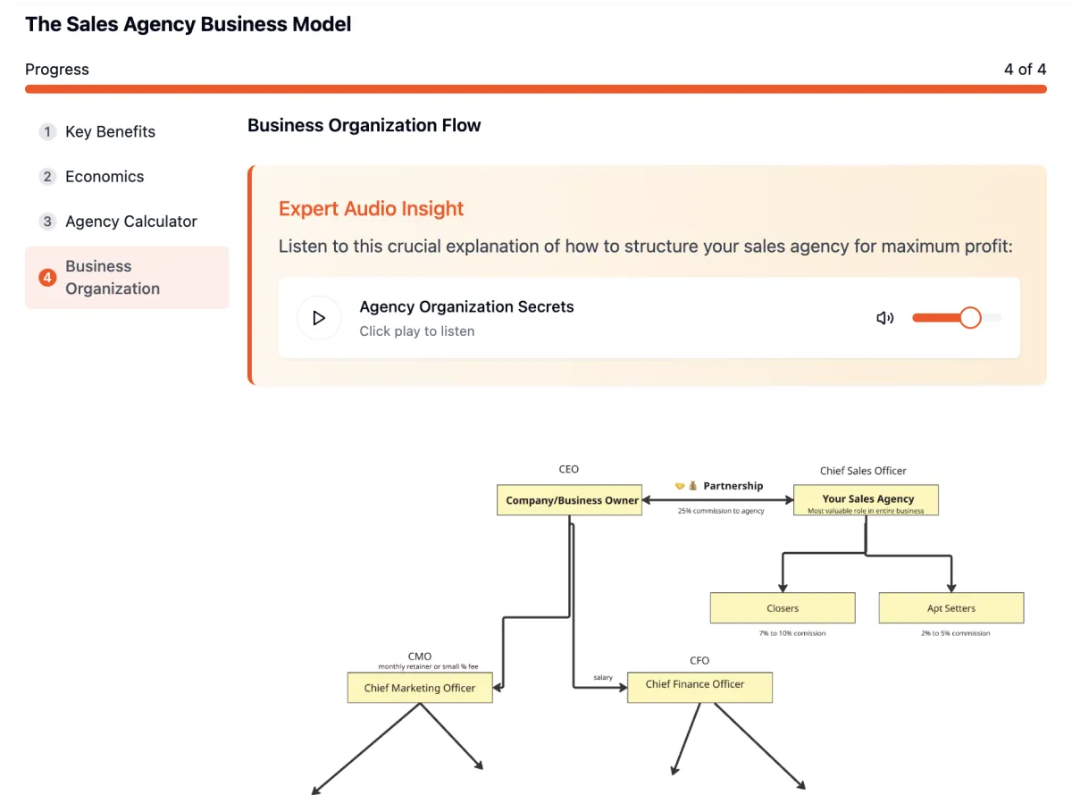 Not really. This is a blueprint for getting started with your sales agency, understanding the business model, the pricing strategy, where to get clients, and how to onboard them. The content is taught in an engaging format with a mix of video, audio, text, calculators, quizzes, and prompts to make learning and absorbing information as easy & fun as possible.